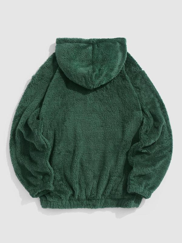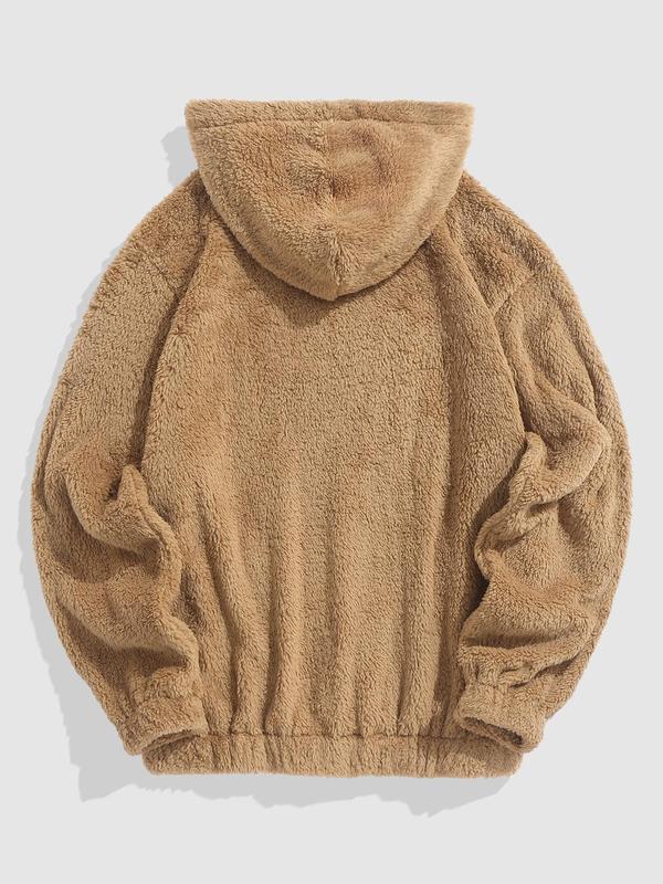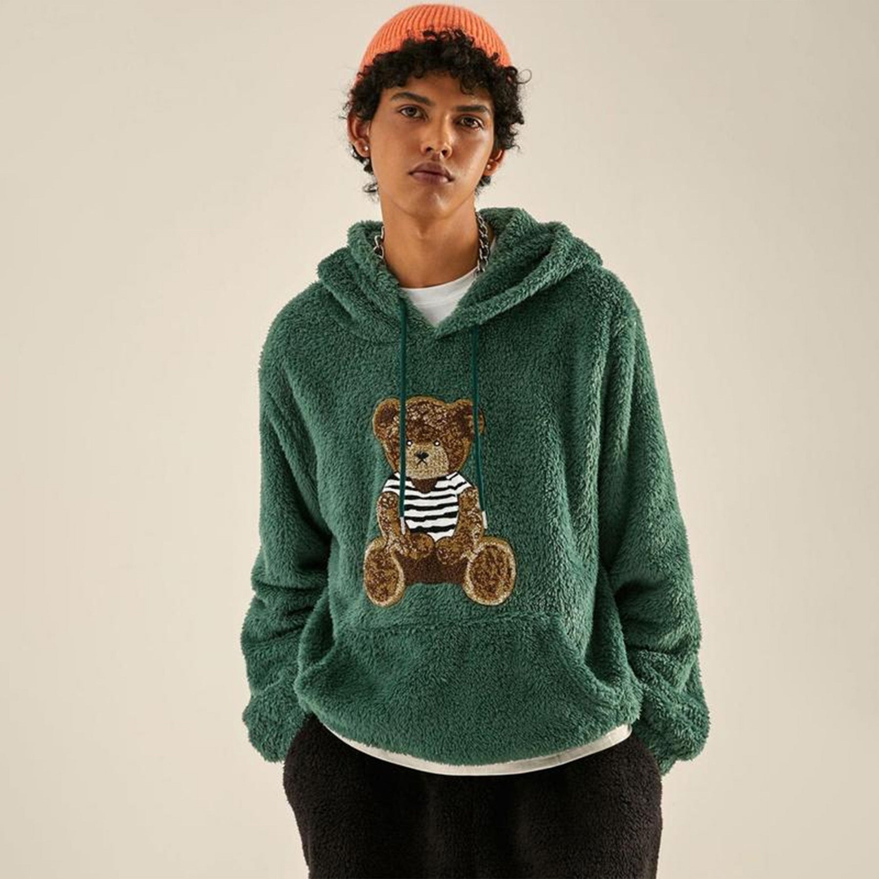 KZZ Men's Cartoon Bear Embroidered Drawstring Plush Hoodie, Casual Pocket Sweatshirt